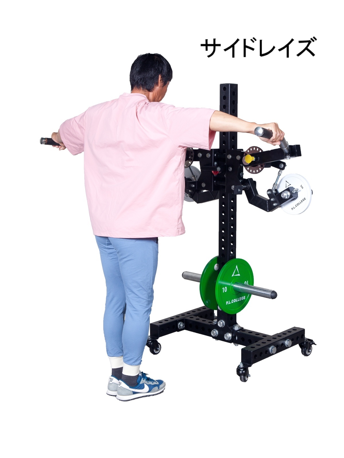 三角筋のトレーニングについては腕が外側に引かれるような動きとなり、ダンベルやケーブルトレーニングにありがちな肩がすくみ負荷が三角筋から僧帽筋に抜けてしまうということなく集中的に効かせることができます。三角筋に効かせにくい方に特におすすめします。
